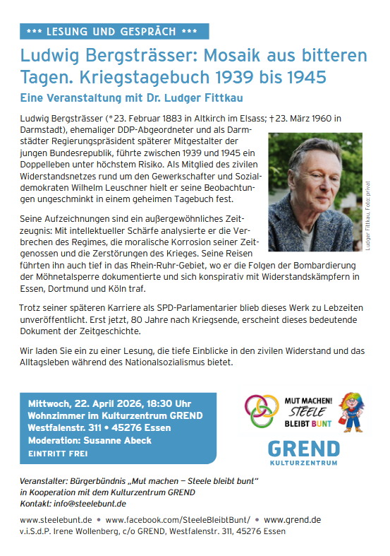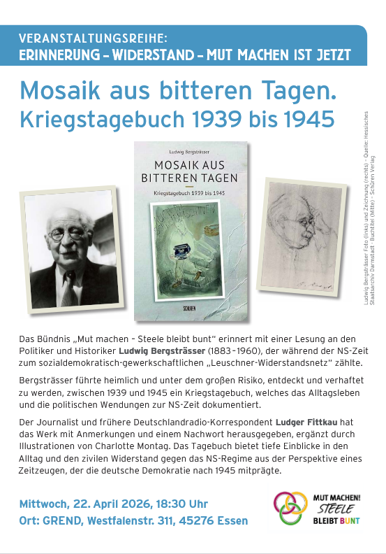 Das Bündnis „Mut machen – Steele bleibt bunt“ erinnert mit einer Lesung an den Politiker und Historiker Ludwig Bergsträsser (1883-1960), der während der NS-Zeit zum sozialdemokratisch-gewerkschaftlichen „Leuschner-Widerstandsnetz“ zählte. Bergsträsser führte heimlich und unter dem großen Risiko, entdeckt und verhaftet zu werden, zwischen 1939 und 1945 ein Kriegstagebuch, welches das Alltagsleben