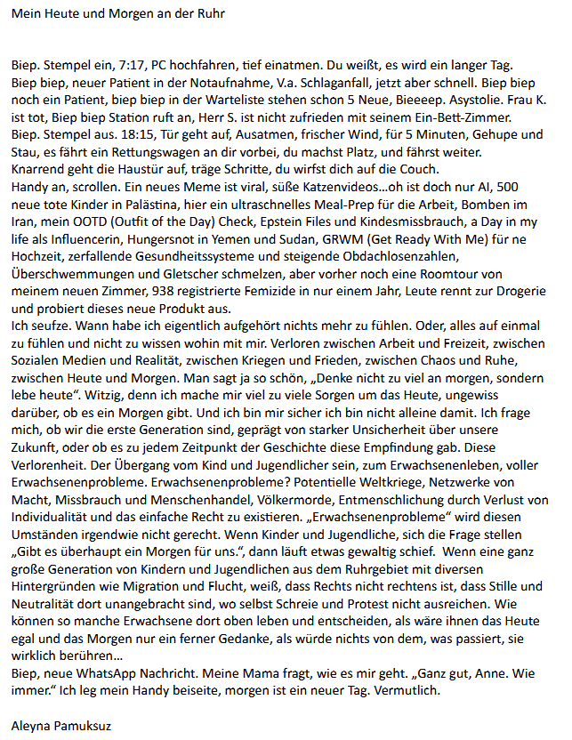 Anschließend las Aleyna Pamuksuz, inzwischen 25 Jahre alt und examinierte Medizinstudentin, ihr Gedicht “Hanau”, das sie 2021 in der Essener Anthologie veröffentlicht hat und das den rechtsradikalen Anschlag in Hanau thematisiert. Auch das beeindruckte, wirkte es doch nach wie vor aktuell. Danach las Aleyna Pamuksuz einen neuen Text, den sie extra zum neuen Thema geschrieben hatte. In ihm schildert ein Erzähler-Ich, offenkundig ein Arzt oder eine Ärztin, protokollartig, was in einer Notaufnahme passiert. Es berichtet vom Tagesablauf zwischen dem Tod von Patienten und Alltagsbanalitäten. Ein Ereignis nach dem anderen. Ohne Unterschied. Nüchtern und sachlich. Dazwischen immer der Piepton des Rufgerätes, der eine detailliertere Auseinandersetzung mit dem Geschehenen unterbricht. Bis ins Privatleben hinein. Das war noch einmal etwas ganz Besonderes. Aleyna Pamuksuz hält uns mit diesem Text einen Spiegel vor. Sie zeigt an, dass wir in unserer computergesteuerten “modernen” Welt nur noch passiv registrieren, was vor sich geht, ohne selbst aktiv zu werden und eigene Akzente zu setzen. Ohne selbst festzulegen, was uns wichtig ist! Das war eine deutliche Kritik an unserem Verhalten! Es zeigte aber auch an: Wenn junge Menschen einmal Feuer gefangen haben beim literarischen Schreiben, dann schreiben sie weiter. Sie haben uns etwas mitzuteilen und wollen gehört werden!