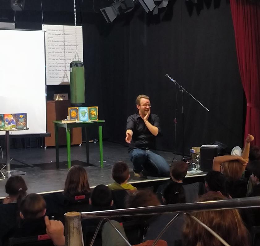 Dann folgten die dritten Klassen, auch sie als Kolleginnen und Kollegen. Bei ihnen ging es um das Buch “Ein Herz für Monster“. Es handelt von der achtkjährigen Ainu und ihrer Mutter Tabati mit ihrem Pony Bifi, die von Dorf zu Dorf ziehen und ihre Dienste als Monsterjägerinnen und Schädlingsbekämpferinnen anbieten. Und auch hier waren die Kinder blitzschnell im Geschehen drin und diskutierten. Klar doch, dass sie alle am Ende der Veranstaltung gerne die Erinnerungskarten von Simak Büchel einsteckten und danach selbst den berühmten Stift in die Hand nahmen und schrieben. So ist es eben, wenn der Kollege ein Schriftsteller ist! Wunderschön war das. Das sagte auch Simak Büchel, dessen Name schon andeutet, was ihm wichtig ist: Dass Kinder Bücher lesen und darüber miteinander sprechen!